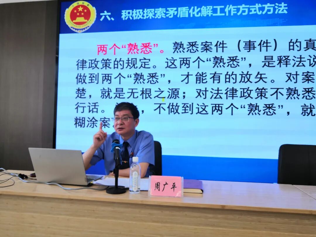 授课中,为引导学员牢记为民司法这个“初心”,及时把矛盾纠纷化解在基层、化解在萌芽状态,让人民群众切实感受到党的温暖、司法的温情,周广平同志以自身梳理总结的“123314”调解工作法为切入点,结合多年化解案访矛盾纠纷的工作经验,用一个个鲜活的案例,从调解时讲话的艺术技巧、做到两个“熟悉”、坚持“三心”、达到三个意图、借助外援、实现四个效果等方面,深入浅出地阐述了新时代政法队伍如何做好矛盾纠纷化解工作。